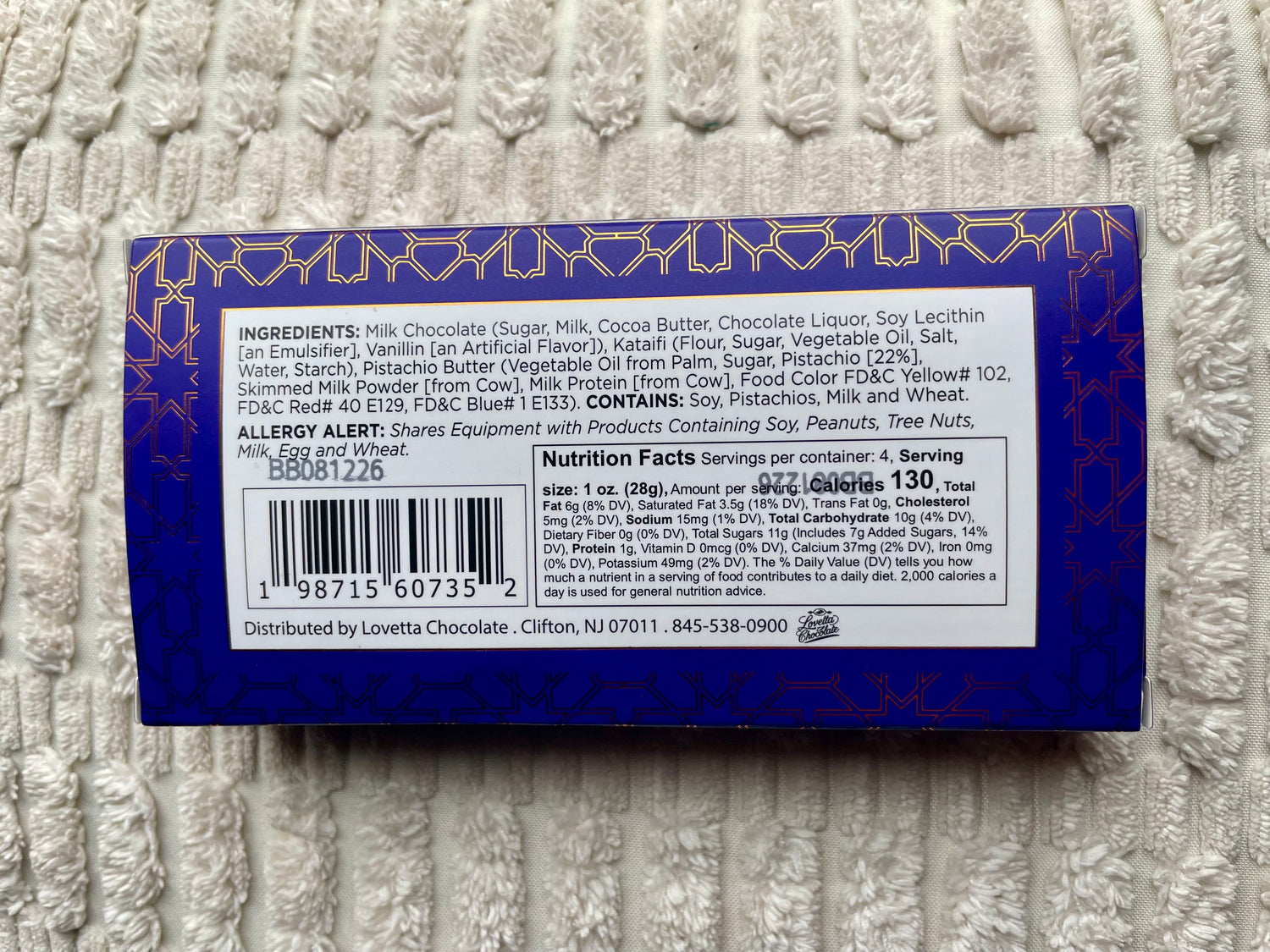 Allergy Alert: Shares equipment with products containing soy, peanuts, tree nuts, milk, egg and wheat.